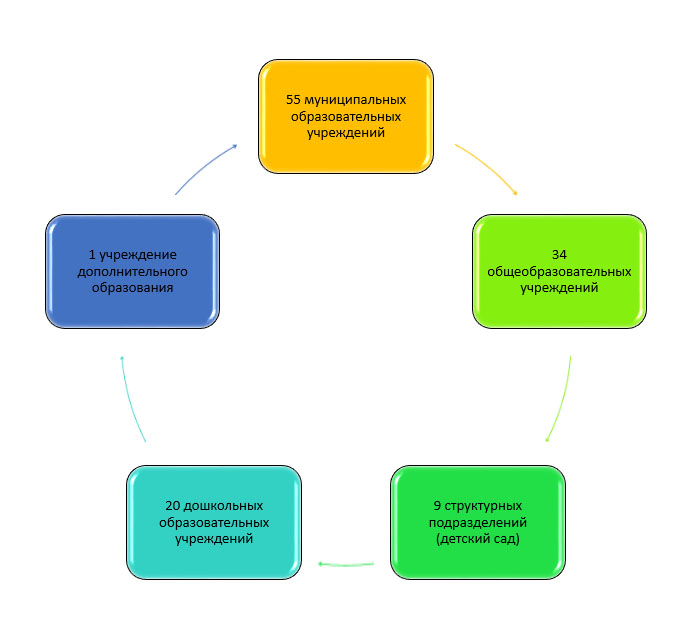 Муниципальная система образования Сакского района представляет собой развитую сеть образовательных организаций: 55 муниципальных образовательных учреждений, находящихся в ведении отдела образования, в том числе 34 общеобразовательных учреждений, в 9 которых имеются структурные подразделения детский сад, 20 дошкольных образовательных организаций, 1 учреждение дополнительного образования.